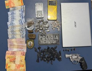 Durante o cumprimento do mandado de busca domiciliar na residência do alvo, os policiais civis apreenderam um revólver calibre .38, de uso permitido, municiado com cinco munições intactas, além de 39 pedras pequenas de crack, 20 porções pequenas e três porções médias de maconha, uma balança de precisão, um aparelho celular, dinheiro em espécie e um vasto acervo documental que pode contribuir para o aprofundamento das investigações sobre falsificação de documento público.