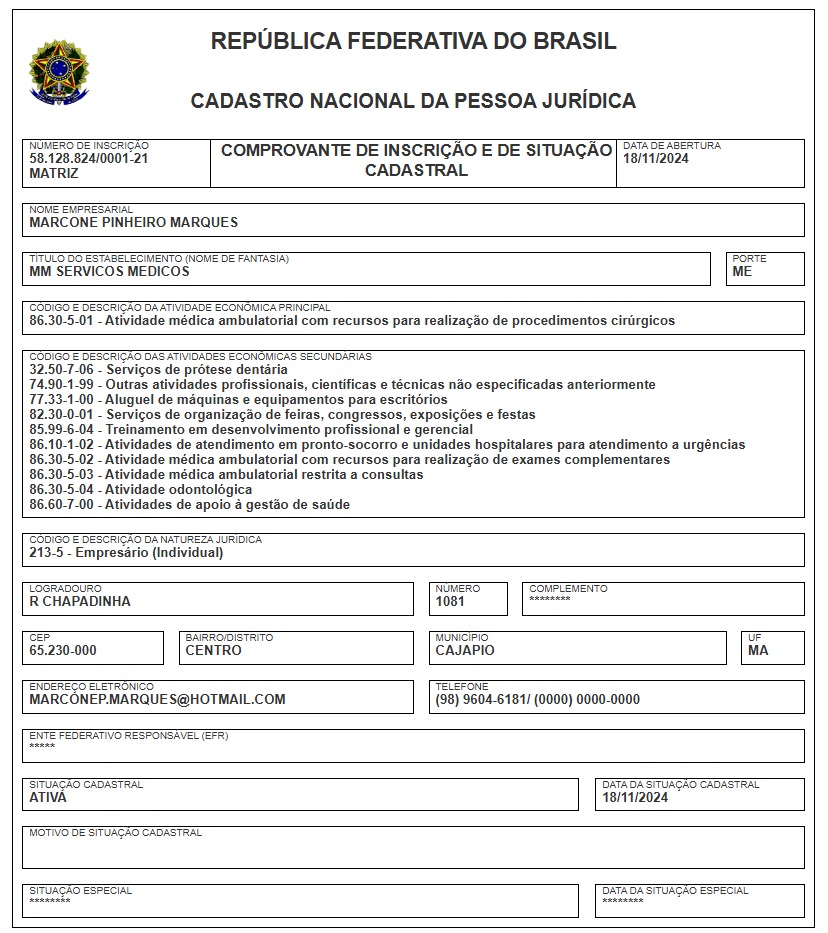 📌 Empresa foi aberta após as eleições De acordo com dados da Receita Federal, o CNPJ foi aberto em novembro de 2024, logo após o resultado das eleições municipais. Poucos meses depois, em fevereiro de 2025, a empresa já aparece como contratada pela prefeitura por meio de credenciamento para prestação de serviços médicos.