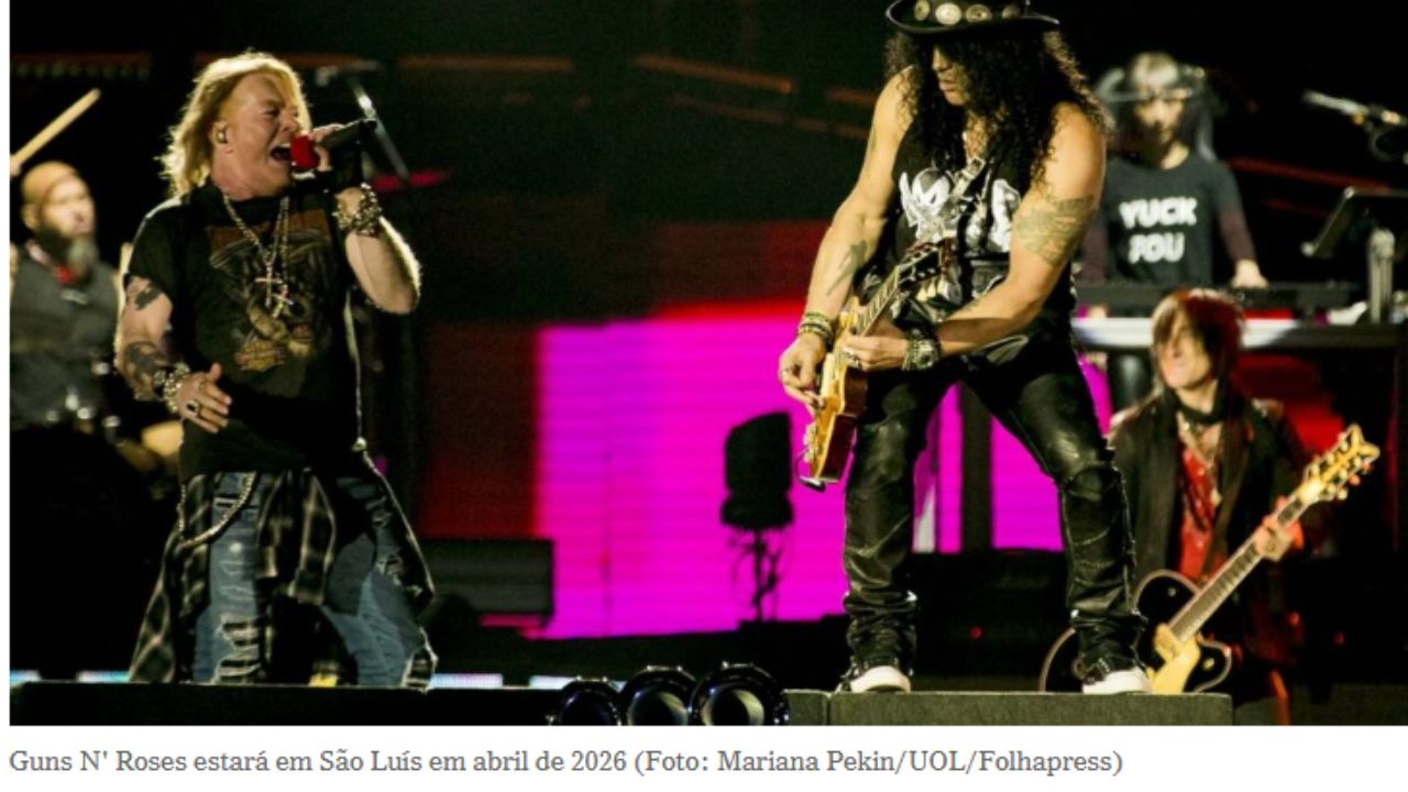 A banda norte-americana Guns N’ Roses incluiu São Luís na agenda oficial da turnê mundial de 2026. O show está marcado para o dia 21 de abril, no Estádio Castelão, conforme divulgado nos perfis oficiais do grupo.